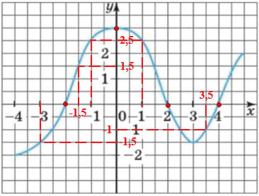 2) Множество значений функции — это все значения \(y\), которые принимает график на заданном промежутке \(x\in[-4;5]\); то есть от наименьшего \(y\) на этом отрезке до наибольшего \(y\).