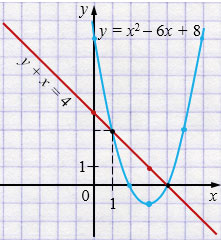 а) парабола \(y=x^2-6x+8\) и прямая \(x+y=4\);