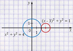 в) окружности \(x^2+y^2=4\) и \((x-3)^2+y^2=1\);