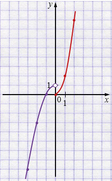 в) \(y=\begin{cases}2x^2,\; \text{если } x\ge0,\\ -x^2+1,\; \text{если } x<0\end{cases}\)