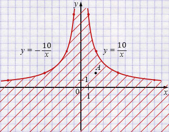 \[ \begin{cases} y\leq\dfrac{10}{x}, \, \text{при} \, x > 0,\\[8pt] y \leq -\dfrac{10}{x}, \, \text{при} \, x < 0 \end {cases} \]