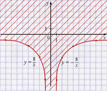 \[ \begin{cases} y \geq -\dfrac{8}{x}, \, \text{при} \, x > 0,\\[8pt] y \geq\dfrac{8}{x}, \, \text{при} \, x < 0 \end {cases} \]