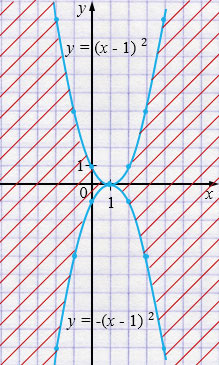 \[ \begin{cases} y \leq (x-1)^2, \, \text{при} \, y \ge 0,\\[8pt] y \geq -(x-1)^2, \, \text{при} \, y < 0 \end {cases} \]