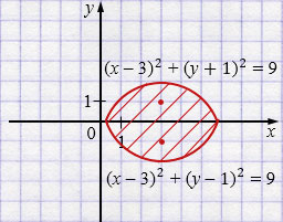 \[ (x-3)^2+(|y|+1)^2\leq 9 \]