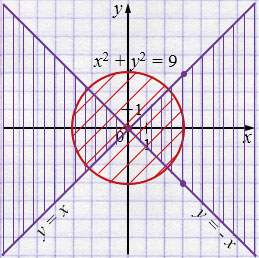 б) \(\left\{\begin{aligned} x^2+y^2\leq 9, \\ |y|-|x|\leq 0. \end{aligned}\right.\)
