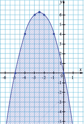 Изобразим на координатной плоскости множество решений неравенства \(y\leq-x^2-5x\). Для этого построим график уравнения \(y=-x^2-5x\). Тогда решениями данного неравенства будут координаты точек, принадлежащих параболе \(y=-x^2-5x\), и координаты точек, расположенных ниже ее.