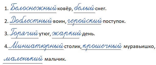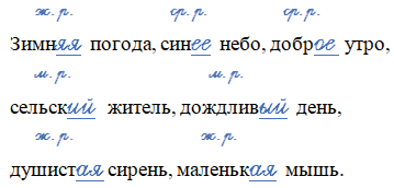Зимн__ погода, син__ небо, добр__ утро, сельск__ житель, дождлив__ день, душист__ сирень, маленьк__ мышь.
