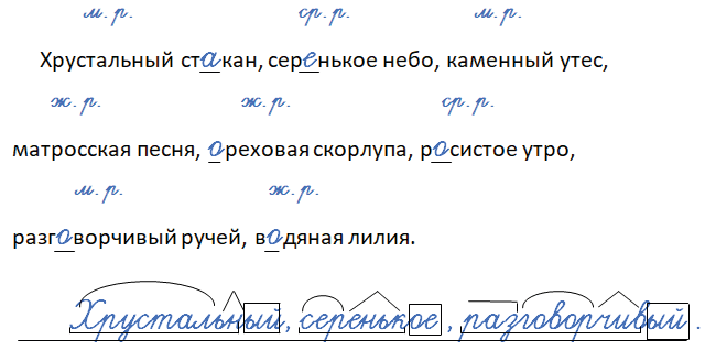 Хрустальный (м. р.) стакан, серенькое (ср. р.) небо, каменный (м. р.) утес, матросская (ж. р.) песня, ореховая (ж. р.) скорлупа, росистое (ср. р.) утро, разговорчивый (м. р.) ручей, водяная (ж. р.) лилия.