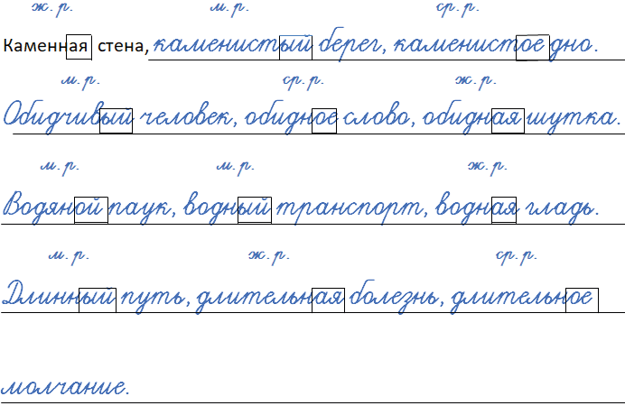 Каменный, каменистый (стена, берег, дно). Обидный, обидчивый (человек, слово, шутка). Водный, водяной (паук, транспорт, гладь). Длинный, длительный (путь, болезнь, молчание).