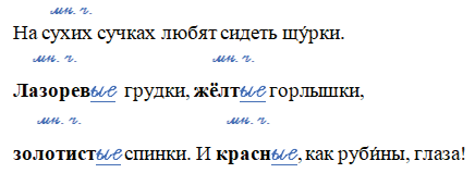 На сухих сучках любят сидеть щу́рки. Лазорев__ грудки, жёлт__ горлышки, золотист__ спинки. И красн__, как руби́ны, глаза!