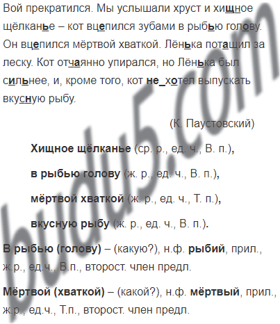 Образец записи: хищное (щёлканье) – (какое?), н.ф. хищный, прил., ср.р., ед.ч., В.п., второст. член предл.
