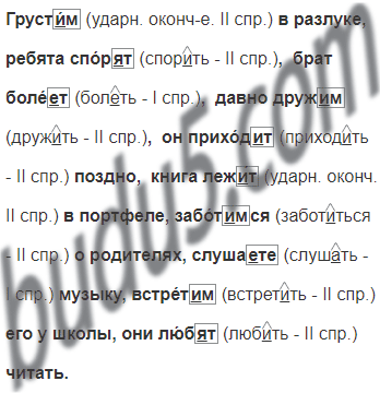 Груст_м в разлуке, ребята спор_т, брат боле_т, давно друж_м, он приход_т поздно, книга леж_т в портфеле, забот_мся о родителях, слуша_те музыку, встрет_м его у школы, они люб_т читать.