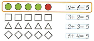 2 + 3, значит, раскрашиваем 2 зелёные фигуры и 3 красные.