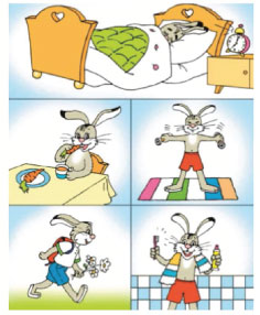 Сначала зайчик сделал зарядку, потом почистил зубы.