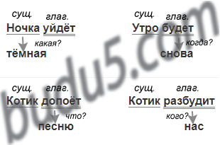Прочитай. Найди в каждом предложении главные и второстепенные члены. Рассуждай, как в образце упр. 410. Выпиши из каждого предложения грамматическую основу. Покажи графически, к подлежащему или к сказуемому относятся второстепенные члены.