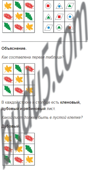 1. Рассмотри каждую таблицу и расскажи, как надо расположить рисунки в последней строке, чтобы все строки в таблице были разными.