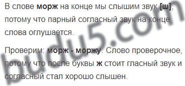 Обрати внимание на слово морж. Какой звук ты слышишь в конце? Рассмотри, как написано это слово. Какая буква написана в конце слова? Что же получается: слышится звук [ш], а пишется буква ж. Почему? Ответ на этот вопрос ты можешь найти в самом стихотворении. Найди проверочное слово к слову морж. Почему оно проверочное? Какая буква написана в этом слове после ж?