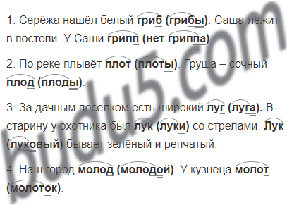 1. Серёжа нашёл белый гриб. Саша лежит в постели. У Саши грипп. 2. По реке плывёт плот. Груша – сочный плод. 3. За дачным посёлком есть широкий луг. В старину у охотника был лук со стрелами. Лук бывает зелёный и репчатый. 4. Наш город молод. У кузнеца молот.