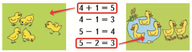Было 5 утят. 2 утёнка ушли. Осталось 3 утёнка.