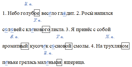 1. Небо голубое вес_ло гл_дит. 2. Росы́ напился с_л_вей с кл_нового листа. 3. Я принёс с собой ароматный кусоч_к с_сновой смолы. 4. На трухлявом п_ньке грелась мал_нькая ящерица.