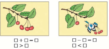 Было 3 птички. Прилетела еще 1. Стало 4 птички.