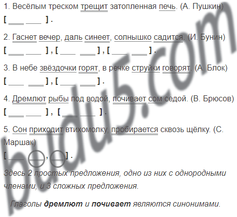 1. Весёлым треском трещит затопленная печь. (А. Пушкин) 2. Гаснет вечер, даль синеет, солнышко садится. (И. Бунин) 3. В небе звёздочки горят, в речке струйки говорят. (А. Блок) 4. Дремлют рыбы под водой, почивает сом седой. (В. Брюсов) 5. Сон приходит втихомолку, пробирается сквозь щёлку. (С. Маршак)