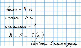 2. На тарелке было 8 помидоров. Съели 5 помидоров.
