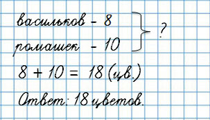 2. В букете 8 васильков, а ромашек на 2 больше. Сколько всего цветов в букете?