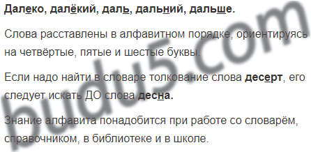 Вспомни точное название букв русского алфавита. В какой последовательности в толковом словаре будут расположены словарные статьи о словах даль, дальний, далёкий, далеко, дальше? Почему? Запиши эти слова в нужной последовательности и проверь по словарю С.И. Ожегова. Если тебе нужно найти в словаре толкование слова десерт, ты будешь искать его до или после слова десна? В каких ещё случаях может понадобиться хорошее знание алфавита?
