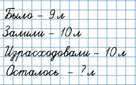2. В баке машины было 9 л бензина. При заправке в бак залили ещё 10 л бензина. На поездку в город израсходовано 10 л бензина.