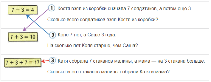 Костя взял из коробки снача­ла 7 солдатиков, а потом ещё 3.