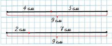 К первому заданию пояснение не требуется: просто отмерь 4 см, поставь точку. Получишь два отрезка длиной 4 см и 5 см.