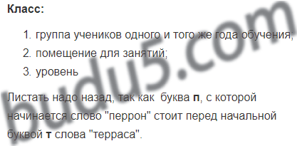 В конце учебника есть толковый словарик. Каждая словарная статья объясняет (толкует) значение одного слова. Найди и прочитай словарную статью о слове класс. Как ты будешь искать это слово в словаре? Предположим, ты хочешь уточнить по словарю значение слова перрон. Ты открыл словарь и увидел слово терраса. Назад или вперёд ты будешь листать страницы словаря? Почему?