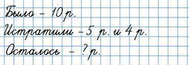 Миша купил ручку за 5 р. и блокнот за 4 р. Сколько рублей ему должны дать сдачи с 10 р.?