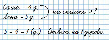 Саша нарисовал 4 ёлочки, а Лена 5 берёзок. На сколько больше деревьев нарисовала Лена?