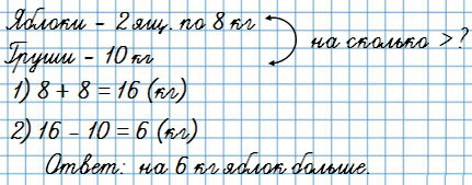 2. В школьный буфет привезли два ящика яблок, по 8 кг в каждом, и 10 кг груш. Узнай сначала, сколько привезли килограммов яблок, а потом, на сколько килограммов больше привезли яблок, чем груш.