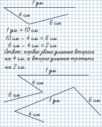 6. Начерти ломаную из трёх звеньев: длина первого - 1  дм, второго - 6 см, а третьего - 4  см. Узнай, на сколько сан­тиметров первое звено длиннее второго, а второе - длиннее третьего.
