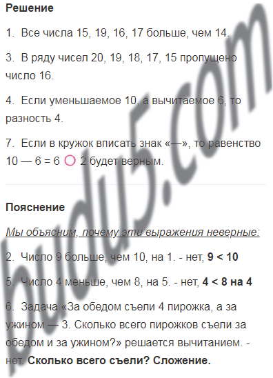 6. Задача «За обедом съели 4 пирожка, а за ужином — 3. Сколько всего пирожков съели за обедом и за ужином?» решается вычитанием.