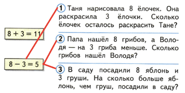 В саду посадили 8 яблонь и 3 груши. На сколько больше яб­лонь, чем груш, посадили в саду?