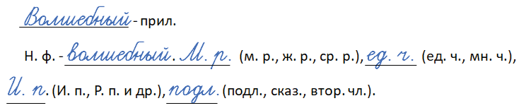 Н. ф. - волшебный, М. р., ед. ч., И. п., втор. чл. - определение.