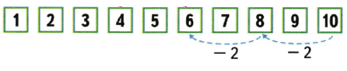 Значит, из числа 10 вычитаем сначала 2 и попадаем на цифру 8, а потом вычитаем еще 2 и попадаем на цифру 6.