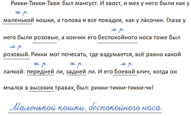 Рикки - Тикки - Тави был мангуст. И хвост, и мех у него были как у маленькой (ж. р.) кошки, а голова и все повадки, как у ласочки. Глаза у него были розовые, а кончик его беспокойного (м. р.) носа тоже был розовый (м. р.). Рикки мог почесать, где вздумается, всё равно какой лапкой: передней (ж. р.) ли, задней (ж. р.) ли. И его боевой (м. р.) клич, когда он мчался в высоких травах, был: рикки-тикки-тикки-чк!