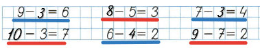 Равенства, в которых пропущены уменьшае­мые, подчеркни красным цветом, а равенства, в которых пропущены вычитаемые, — синим. Запиши пропущенные числа.