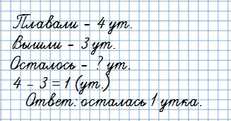 На пруду плавали 4 утки и 8 гусей. На берег вышли 3 утки и столько же гусей. Сколько уток и сколько гусей осталось в воде?