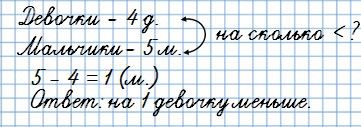 На карусели катались 4 девочки и 5 мальчи­ков. На сколько меньше девочек, чем маль­чиков, каталось на карусели?