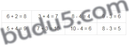 | 5 + 4 = | 7 + 3 = | 10 - 4 = | 8 - 3 = |