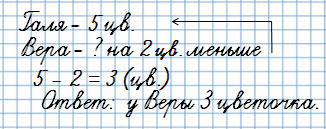 3. Галя вышила 5 цветочков, а Вера — на 2 цветочка меньше. Сколько цветочков вышила Вера? Сколько всего цветочков вышили девочки?
