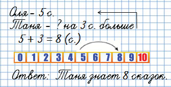 4. Оля знает 5 сказок, а Таня — на 3 больше. Сколько сказок знает Таня?