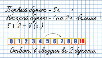 В первом букете 5 гвоздик, а во втором на 2 гвоздики больше. Сколько гвоздик во втором букете?