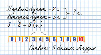 В первом букете 2 белые гвоздики, а во втором 3. Сколько белых гвоздик в двух букетах?